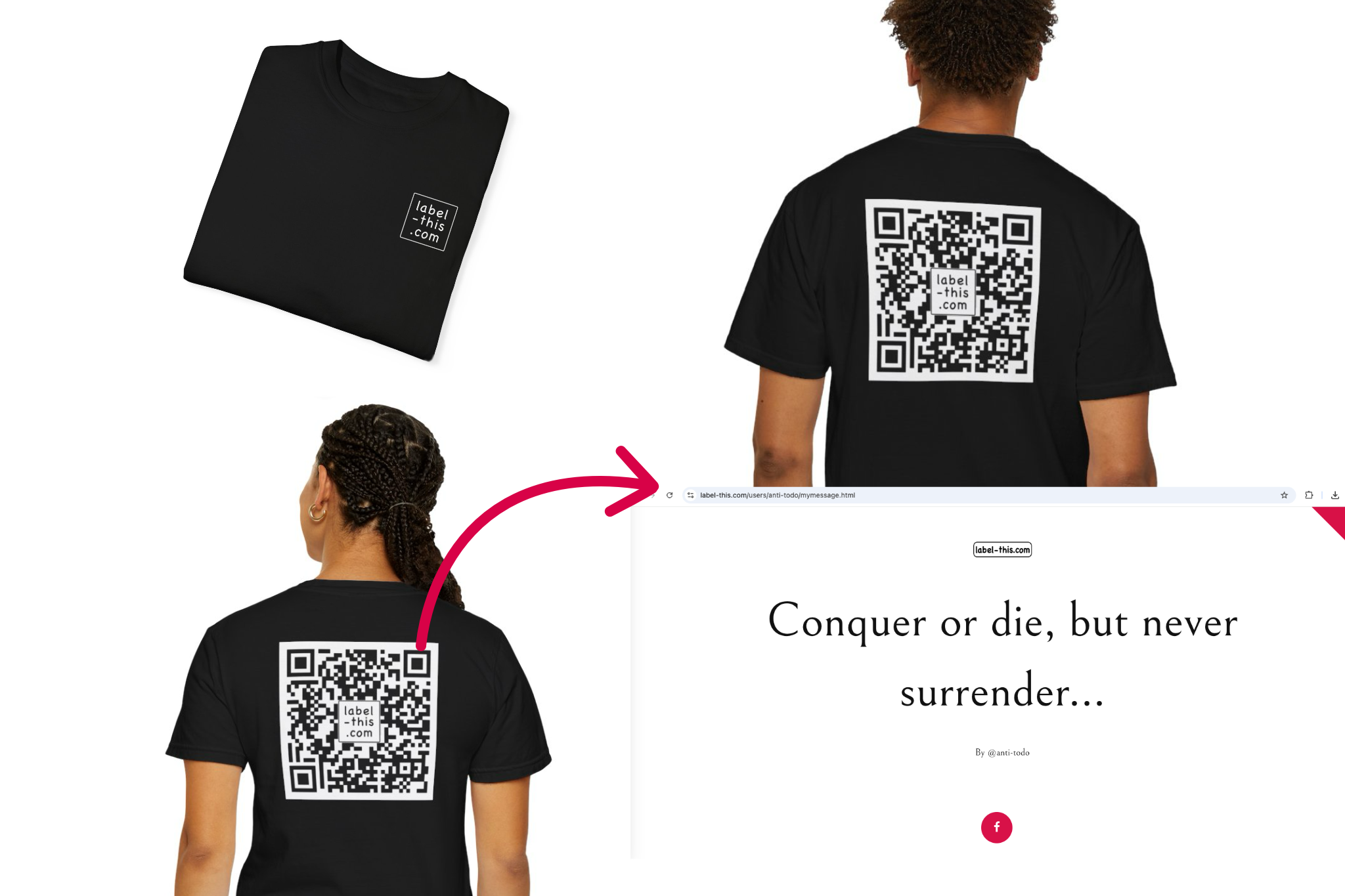 Decide tu mensaje ➡️ Obtén tu código QR impreso en tu camiseta y tu página web ➡️ Usa tu camiseta para que todos conozcan tus escritos ➡️ Cambia tu página web con tus nuevos escritos cuando quieras.